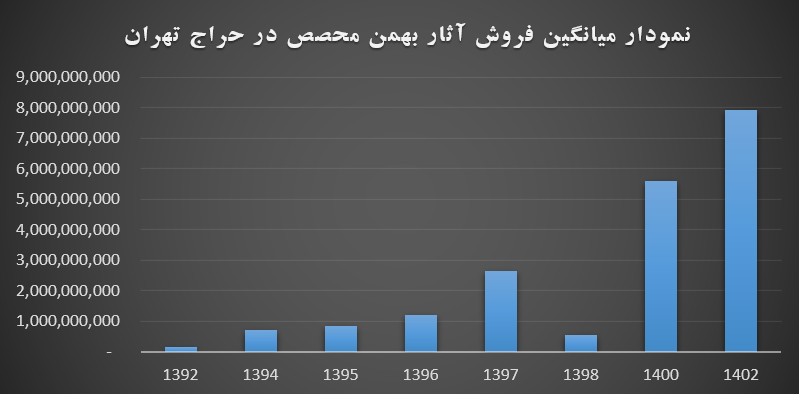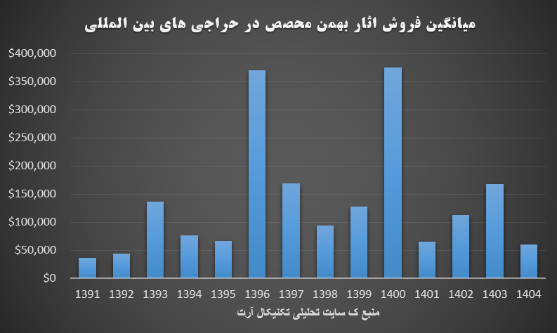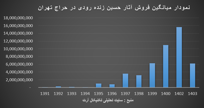 نکته: پایین‌تر بودن قیمت در این نمودار نسبت به سال‌های گذشته لزوماً به معنای کاهش ارزش آثار هنرمند نیست و می‌تواند ناشی از عواملی مانند عرضه و فروش آثار کوچک‌تر یا متفاوت او در حراجی‌ها باشد.