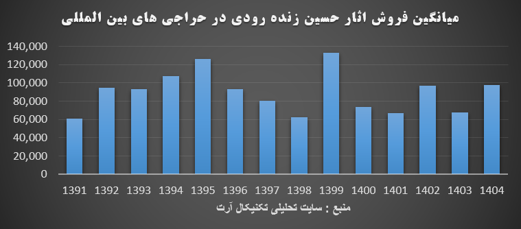 وضعیت میانگین قیمت فروش آثار حسین زنده رودی در حراجی های بین المللی و داخلی به صورت زیر می باشد :