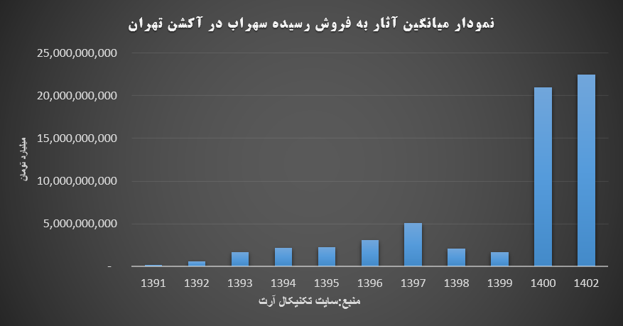 نکته: کاهش میانگین قیمت در این نمودار لزوماً نشان‌دهنده افت ارزش آثار نیست و ممکن است ناشی از عواملی مانند عرضه آثار با ابعاد کوچک‌تر، تکنیک‌های متفاوت یا ترکیب متنوع آثار ارائه‌شده در حراجی‌ها باشد. برای تحلیل دقیق‌تر روند قیمتی، بررسی شرایط عرضه و نوع آثار معامله‌شده ضروری است.