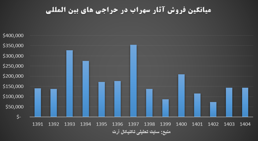 وضعیت میانگین قیمت فروش آثار سهراب سپهری در حراجی های بین المللی به صورت زیر می باشد :