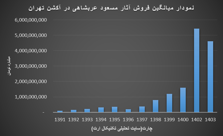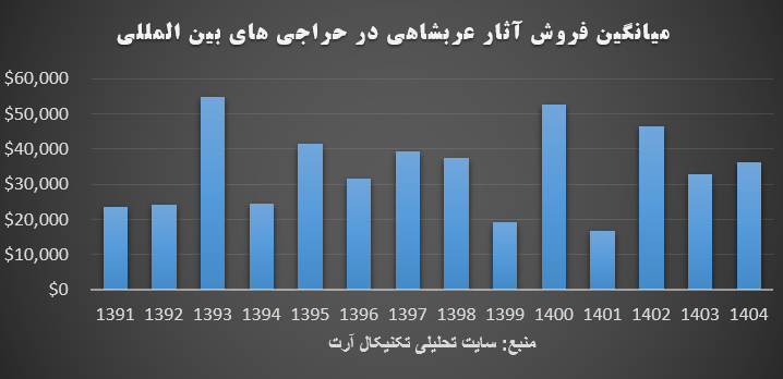وضعیت میانگین قیمت فروش آثار مسعود عربشاهی در حراجی های بین المللی به صورت زیر می باشد :
